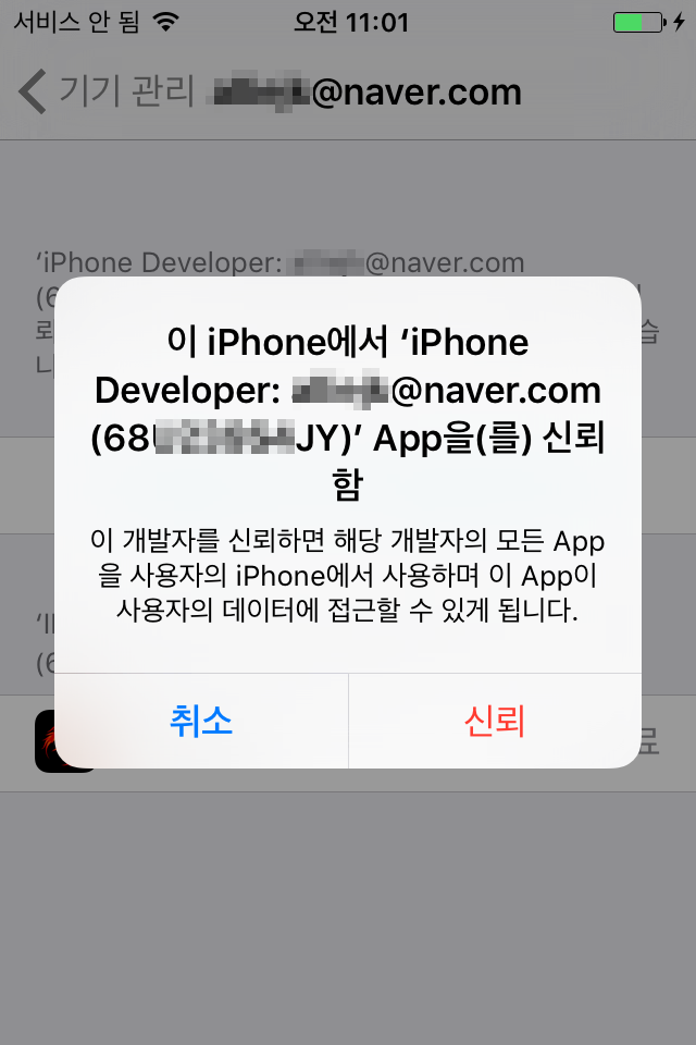 - 아이폰의 설정 > 일반 > 기기 관리로 이동해 아이디 클릭 후, [신뢰] 버튼 클릭